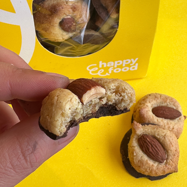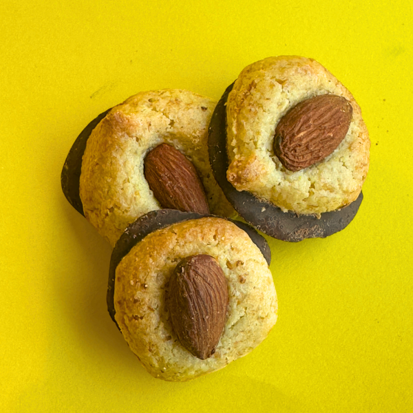 Mini cookies crocantes com base de chocolate negro e amêndoa torrada. Pequenas, intensas e perfeitas para partilhar ou oferecer como mimo de Páscoa.