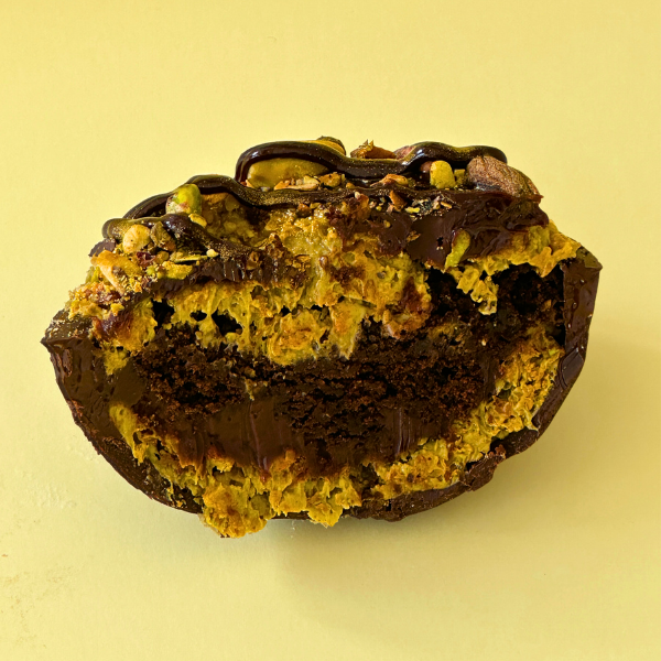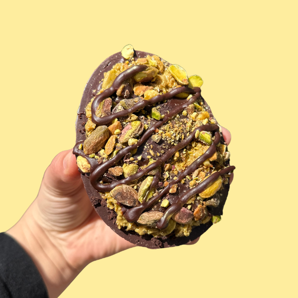 Casca de chocolate negro vegan recheada com creme crocante de pistachio, brigadeiro cremoso e massa de brownie de chocolate. Finalizado com pistachios levemente torrados que trazem contraste e profundidade ao conjunto.